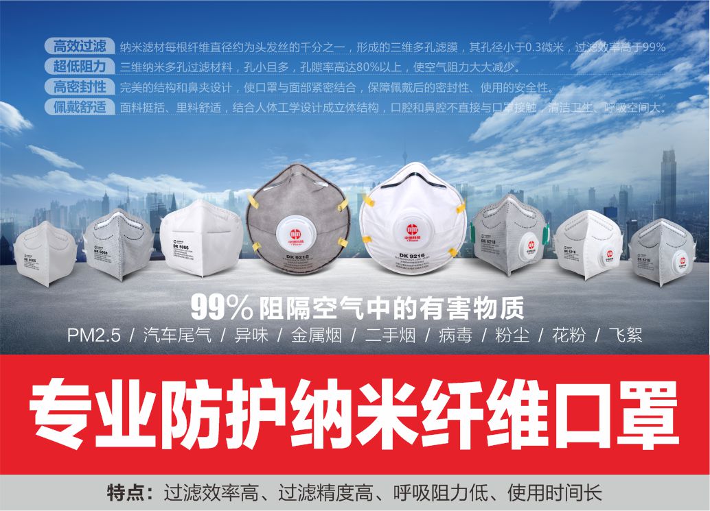 專業防護納米纖維口罩采用本公司研制的納米纖維濾材,其每根纖維直徑在20納米~120納米之間,約為人類頭發絲直徑的千分之一。納米纖維濾材孔小且多,孔隙率高達80%以上,使空氣阻力